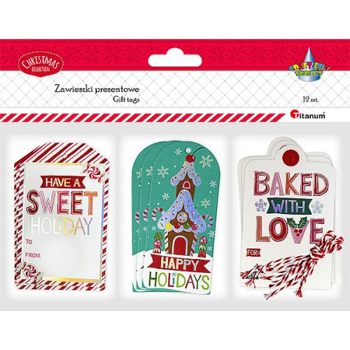 Zawieszki prezentowe cukiernicze 3 wzory z nadrukiem jednostronnym 12szt. + sznureczki biało-czerwone Have a sweet holiday 61x98mm, Happy holidays 34x Zawieszki do prezentów wykonane z kartonu. W każdej zawieszce jest wycięty otwór na dowieszenie sznureczka. Tylna strona zawieszki nie posiada nadruku. W zestawie sznureczki w kolorze biało-czerwonym.