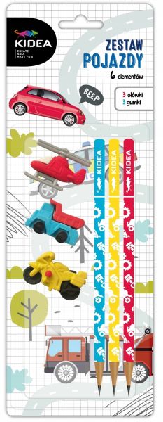 ZESTAW 3 OŁÓWKI + 3 GUMKI POJAZDY KIDEA |