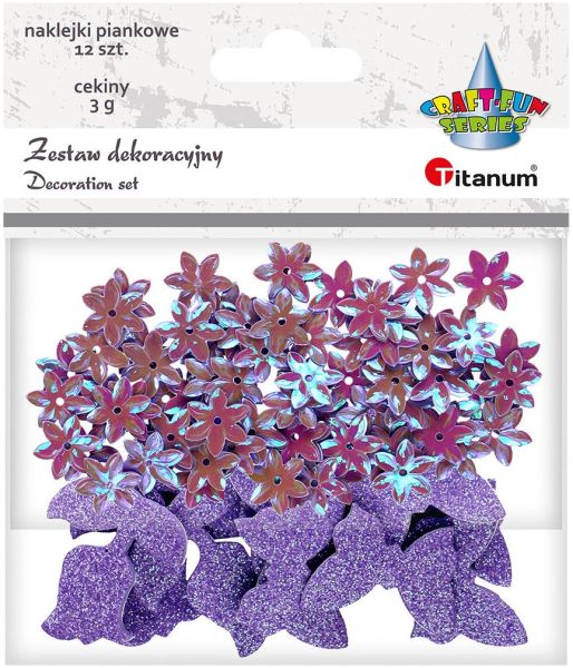 Zestaw cekiny kwiaty 14mm 3g i naklejki piankowe brokatowe motyle 30x20mm i tulipany 29x32mm wrzosowe 12szt. TITWLKZestaw składający się z: cekinów w kształcie kwiatów o średnicy 14 mm i naklejek piankowych brokatowych w kształcie motyli o wymiarach 30 x 20 mm i tulipanów o wymiarach 29 x 32 mm, kolorystyka: wrzosowa. Cekiny 3 gramy, naklejki 12 sztuk. |