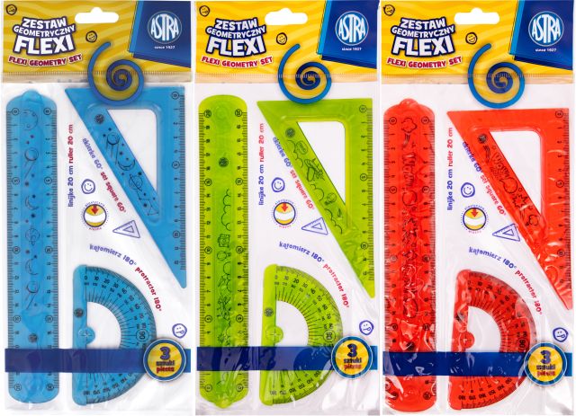 Zestaw geometryczny 3 elementy FLEXI ASTRA - 1 szt. opp bag [opakowanie=24szt]Zestaw geometryczny zawierający trzy elementy: linijkę, kątomierz i ekierkę. Produkty są elastyczne i odporne na pękanie. Zestaw występuję w trzech wariantach kolorystycznych. |