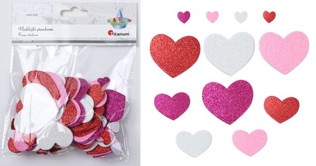 Naklejki piankowe serca brokatowe 3 kolory 100szt. kolory: biały, różowy, czerwony TITWLK26 |