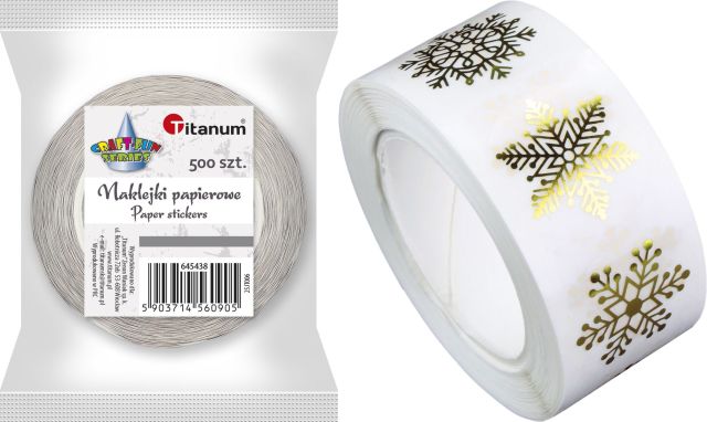 Naklejki foliowe na taśmie 6 wzorów płatki śniegu złote O25mm 500szt. szerokość taśmy 28mm❄️ Naklejki foliowe płatki śniegu złote – 500szt. na taśmie