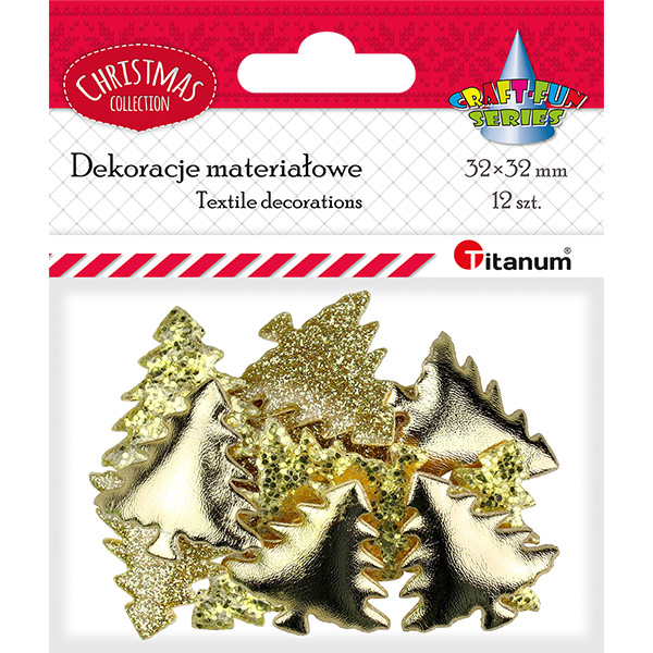 Dekoracje samoprzylepne materiałowe choinki PU 32x32mm 3 wzory: drobny brokat, duży brokat, gładkie złote 12szt. |