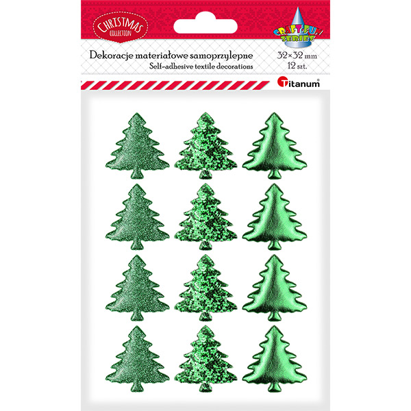Dekoracje samoprzylepne materiałowe choinki PU 32x32mm 3 wzory: drobny brokat, duży brokat, gładkie zielone 12szt. |