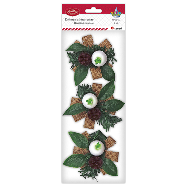 Stroiki świąteczne 10cm na jutowej wstążce z szyszką, listkami i białą styropianową bombką 3szt. |