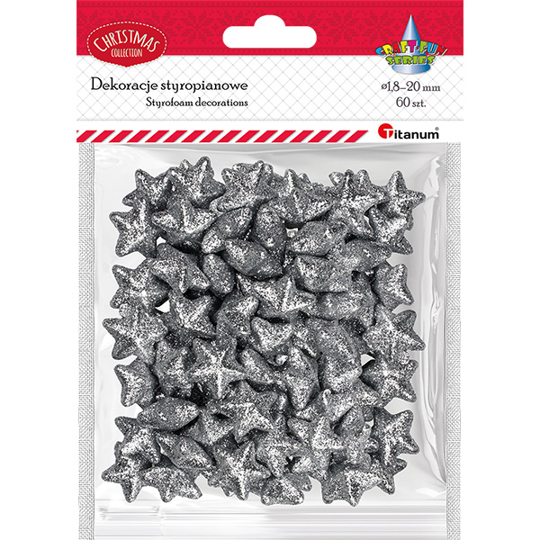 Styropianowe gwiazdki 20x18mm grubość 10mm brokatowe srebrne 60szt. |