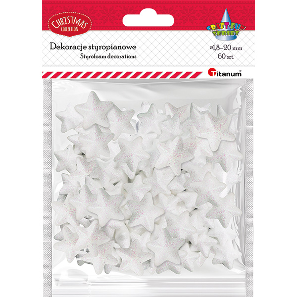 Styropianowe gwiazdki 20x18mm grubość 10mm brokatowe białe 60szt. |