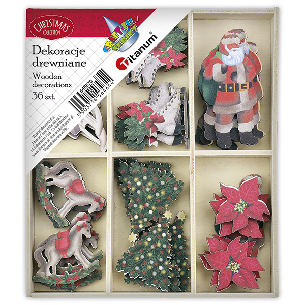 Drewniane dekoracje w drewnianym pudełku 96x110mm 6 wzorów Boże Narodzenie 36szt. Sanki z prezentami, łyżwy, Mikołaj, koń na biegunach, choinka, poins |