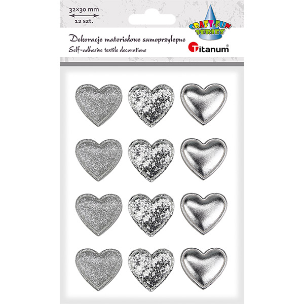 Dekoracje samoprzylepne materiałowe serca PU 32x30mm 3 wzory: drobny brokat, duży brokat, gładkie srebrne 12szt. |