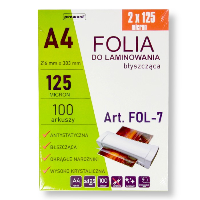 FOLIA LAMINACYJNA FOL-7 2x125mic A4/100 216mmx303mm BŁYSZCZĄCAFolia do laminowania A4: