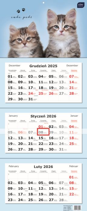 Kalendarz ścienny planszowy33, 5x40cm Koty 2026 Kalendarz na spirali o wymiarach 33,5x40 cm. Wyraźne i czytelne kalendarium w układzie miesiąc na stronie. Przy każdym dniu dużo miejsca na zapiski. 12 dużych i pięknych grafik na każdy miesiąc. Zaznaczone imieniny, najważniejsze daty i święta. |