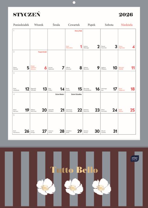 Zaznaczone najważniejsze daty i święta. Praktyczna kieszonka na zapiski i paragony.