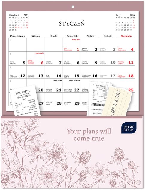 Zaznaczone najważniejsze daty i święta. Zawiera praktyczną kieszonkę na zapiski i paragony. Dwa kwiatowe wzory do wyboru. |