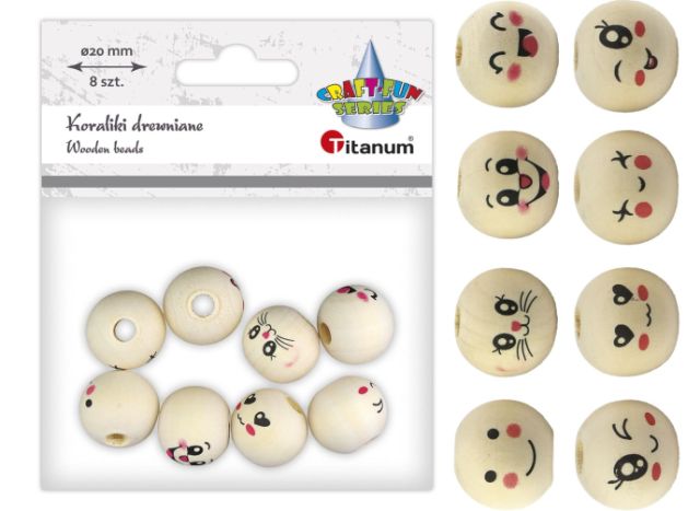 Koraliki drewniane okrągłe emotki O20mm otwór O5mm naturalne drewno 8szt. |