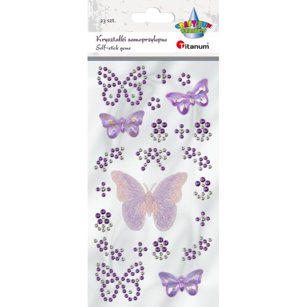 Kryształki samoprzylepne motyle mix (w tym z kryształków 36x28mm, akrylowe 32x18mm, z muliny na tkaninie 54x45mm) fioletowe 23szt. |